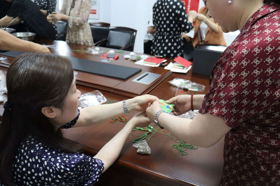 活動現(xiàn)場充滿著歡聲笑語,彌漫著粽葉和艾草的香氣,一片片清香的粽葉、一粒粒晶瑩的糯米、一個個香包在大家的手里變成了一個個誘人的粽子和形態(tài)飽滿的艾草香包,粽子和香包裝滿了大家美好的祝愿。