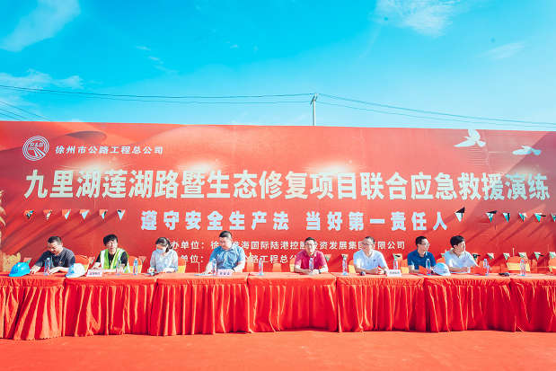 為提高全體參建人員安全意識,增強一線從業(yè)人員自救能力,營造濃厚的“安全生產月”活動氛圍,6月21日下午,陸港集團、各參建方在九里湖國家濕地公園北側沿湖道路(蓮湖路)建設工程第一標段蓮湖路施工現(xiàn)場開展了聯(lián)合應急救援演練活動。